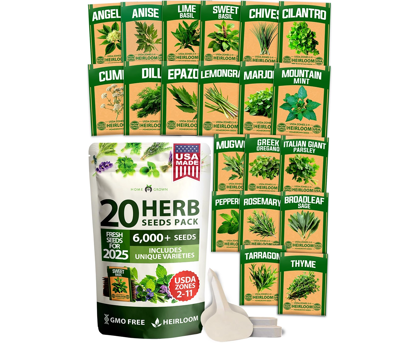 Grow a thriving culinary and medicinal herb garden with 6,000+ non-GMO heirloom seeds, including 20 premium varieties and plant markers for easy planting.