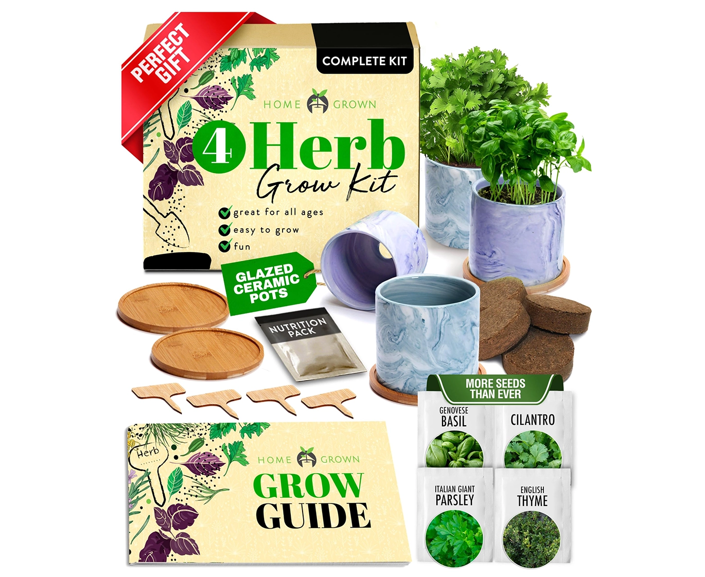 A stylish indoor herb garden kit with a glazed ceramic pot, designed for effortless kitchen window growing—perfect as a unique housewarming or gardening gift.