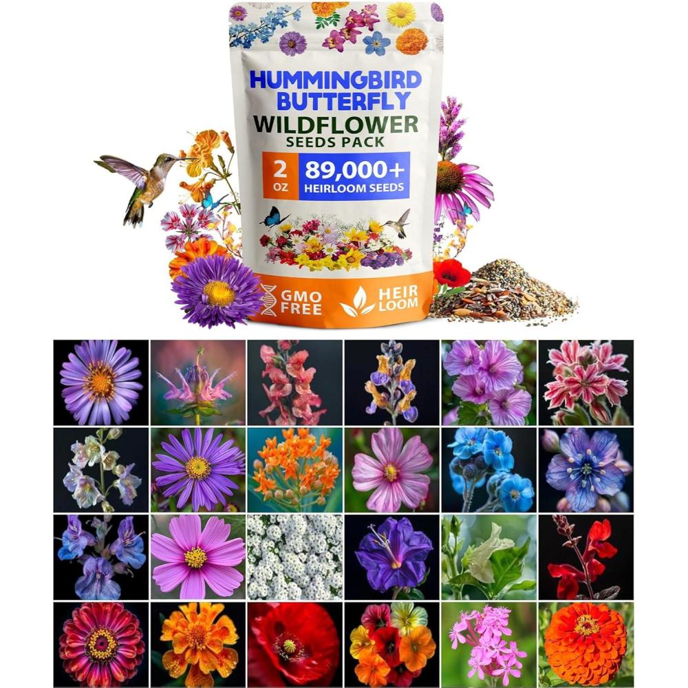 HOME GROWN Wildflower Seeds (3oz) 89,000+ Flower Seed Mix | No Filler | 19 Varieties, USA-Sourced Bulk Wild Flowers Seeds for Planting, Butterfly & Pollinator Perennial and Annual Wild Flower Mix(Hummingbird Lite (2oz))